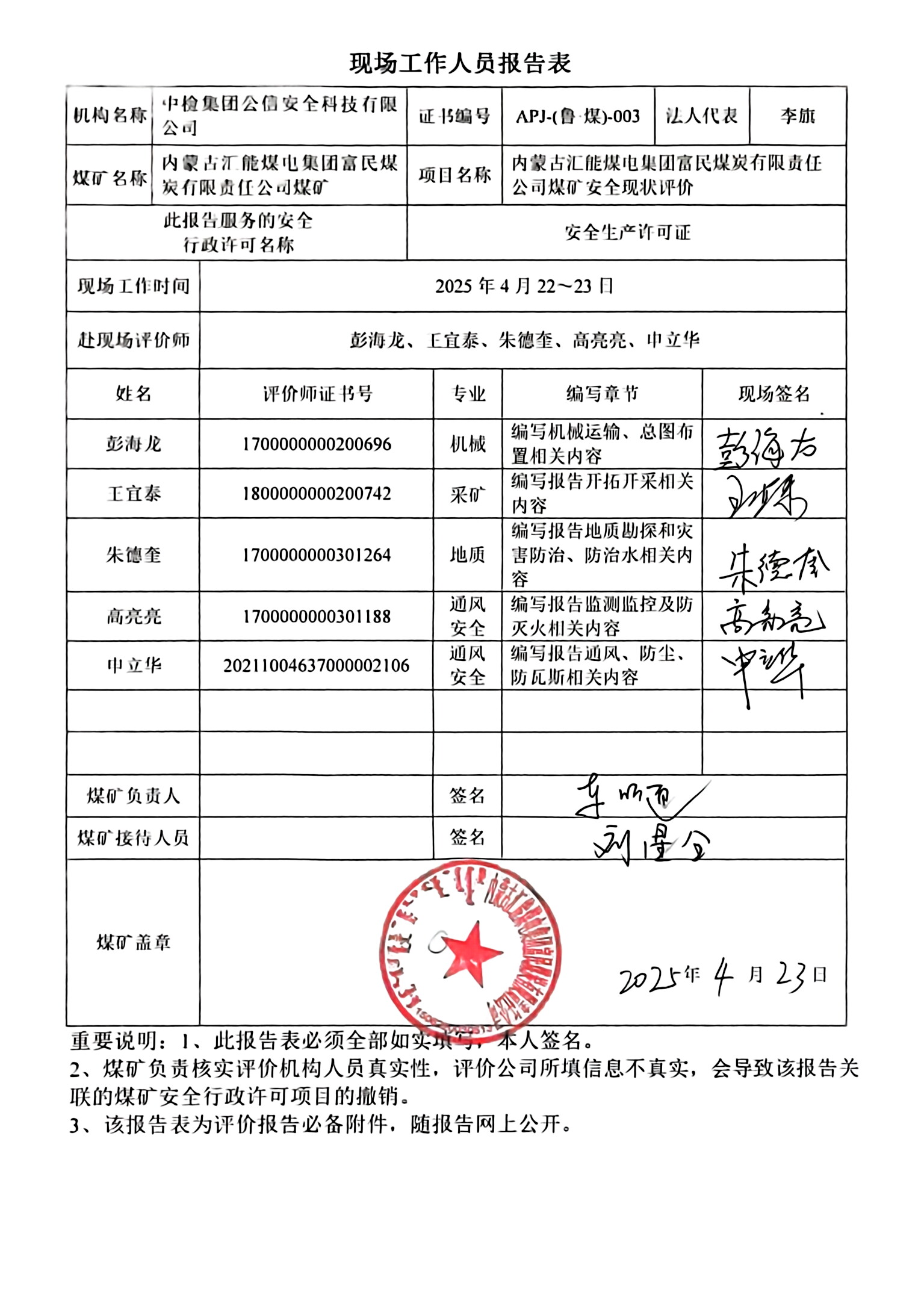 現(xiàn)場開展安全評價工作的人員、時間及主要任務(wù): 彭海龍 高亮亮 申立華 朱德奎 王宜泰于2025年4月22~23日到現(xiàn)場進行調(diào)查、搜集資料,進行現(xiàn)場評價。 彭海龍 申立華于2025年4月25日對現(xiàn)場問題進行復(fù)查,礦方均已整改合格。 彭海龍 高亮亮 申立華 朱德奎 王宜泰 王兆亮 劉超 對報告進行了編寫。 | |||||||