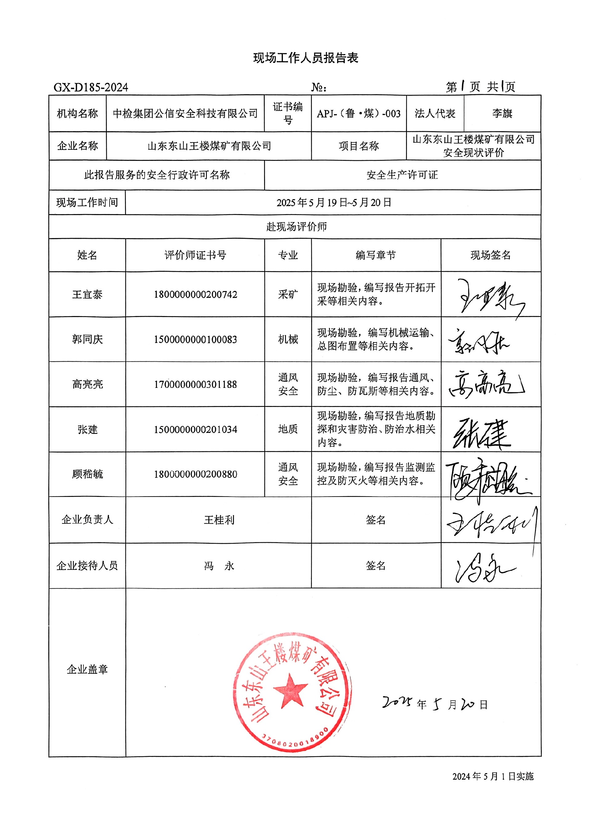 到現(xiàn)場開展安全評價工作的人員、時間及主要任務: 人員:王宜泰、郭同慶、高亮亮、顧嵇毓、張建 時間、任務: 評價項目組于2025年5月19日~20日到現(xiàn)場調(diào)查、檢查;2025年5月22日編寫修改完善報告。 | ||||||