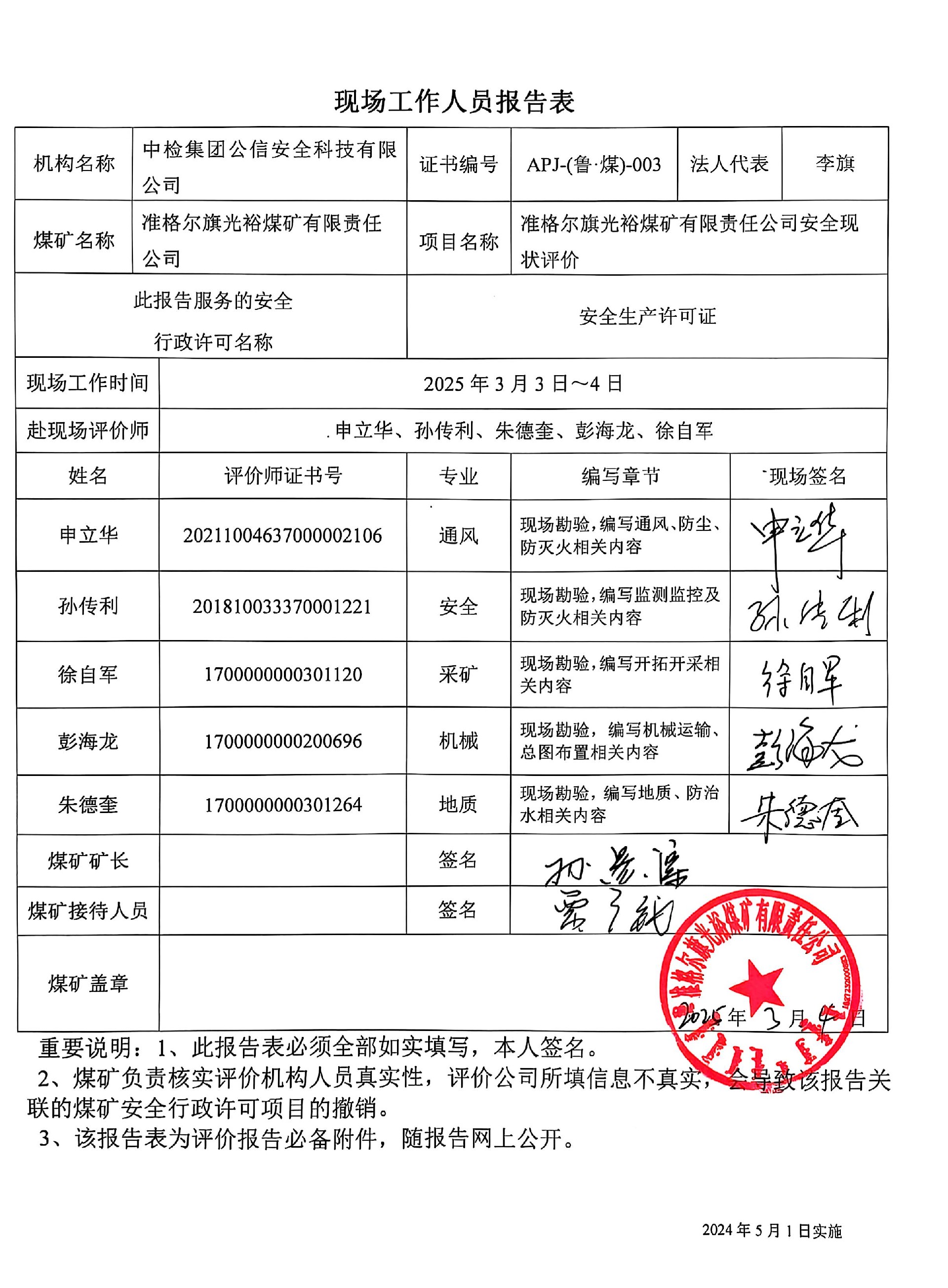現(xiàn)場開展安全評價工作的人員、時間及主要任務(wù): 孫傳利、徐自軍、申立華、朱德奎、彭海龍2025年3月3日~4日到現(xiàn)場進(jìn)行調(diào)查、搜集資料,進(jìn)行現(xiàn)場評價。 | |||||||