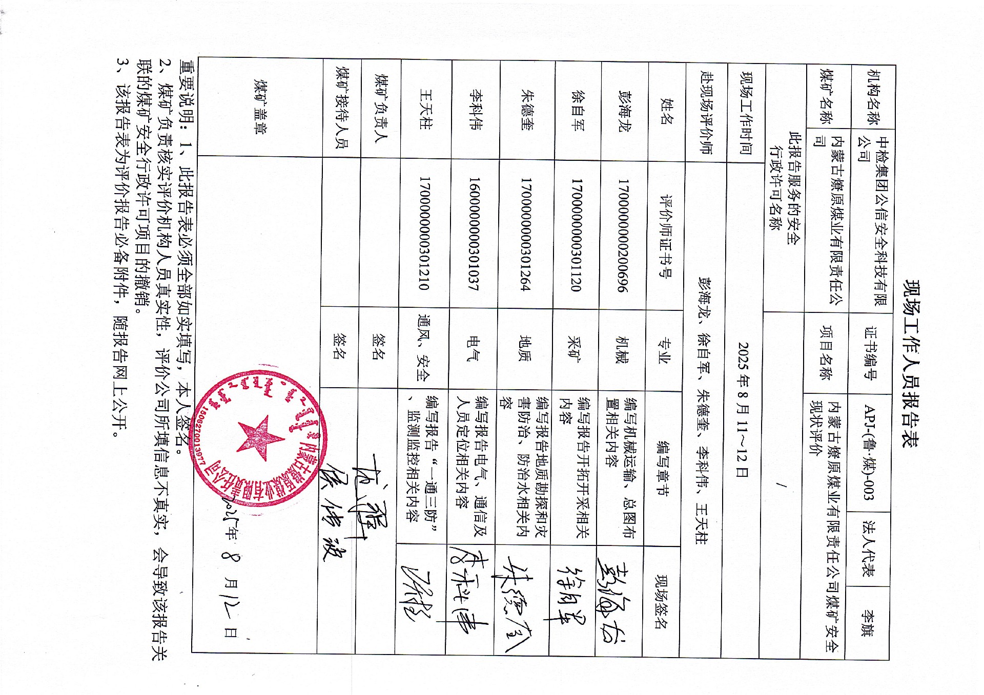 現(xiàn)場(chǎng)開(kāi)展安全評(píng)價(jià)工作的人員、時(shí)間及主要任務(wù): 彭海龍、李科偉、徐自軍、朱德奎、王天柱于2025年8月11日~12日到現(xiàn)場(chǎng)進(jìn)行調(diào)查、搜集資料,進(jìn)行現(xiàn)場(chǎng)評(píng)價(jià)。于2025年8月17日到現(xiàn)場(chǎng)評(píng)價(jià)時(shí)存在的問(wèn)題進(jìn)行了復(fù)查。 | |||||||