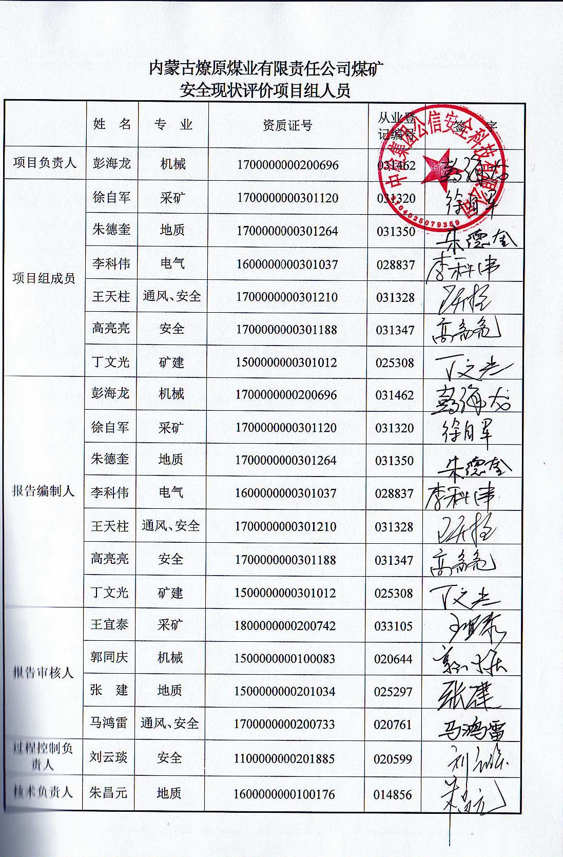 參與安全評(píng)價(jià)工作的注冊(cè)安全工程師: 彭海龍 李科偉、徐自軍 朱德奎 王天柱 高亮亮 丁文光 | |||||||