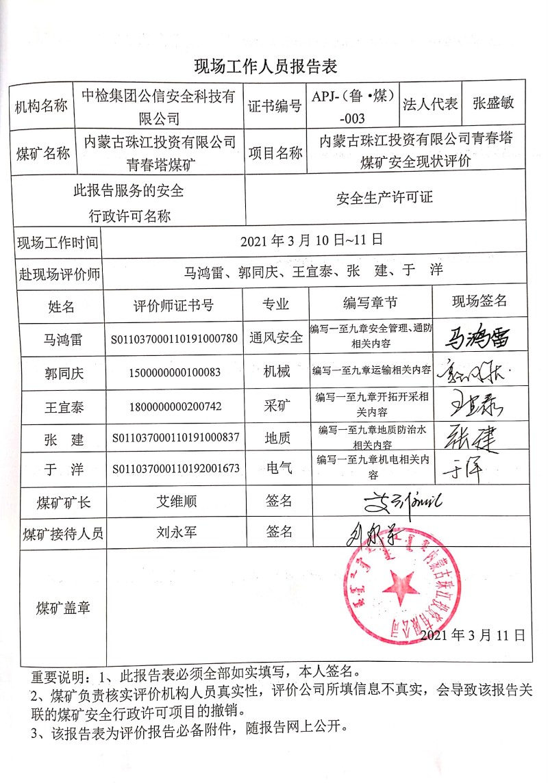 安全評(píng)價(jià)報(bào)告網(wǎng)上公開信息表 季度:二季度 評(píng)價(jià)項(xiàng)目名稱 內(nèi)蒙古珠江投資有限公司青春塔煤礦安全現(xiàn)狀評(píng)價(jià)