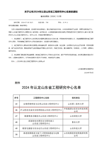 2024年7月4日,山東省發(fā)展和改革委員會公布了2024年認定山東省工程研究中心名單的通知,依托中檢集團公信安全科技有限公司申報的“礦山機電安全檢測檢驗山東省工程研究中心”位列其中。山東省工···