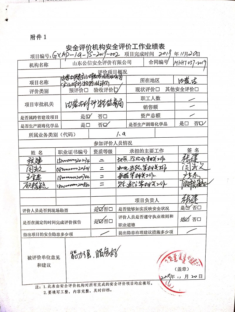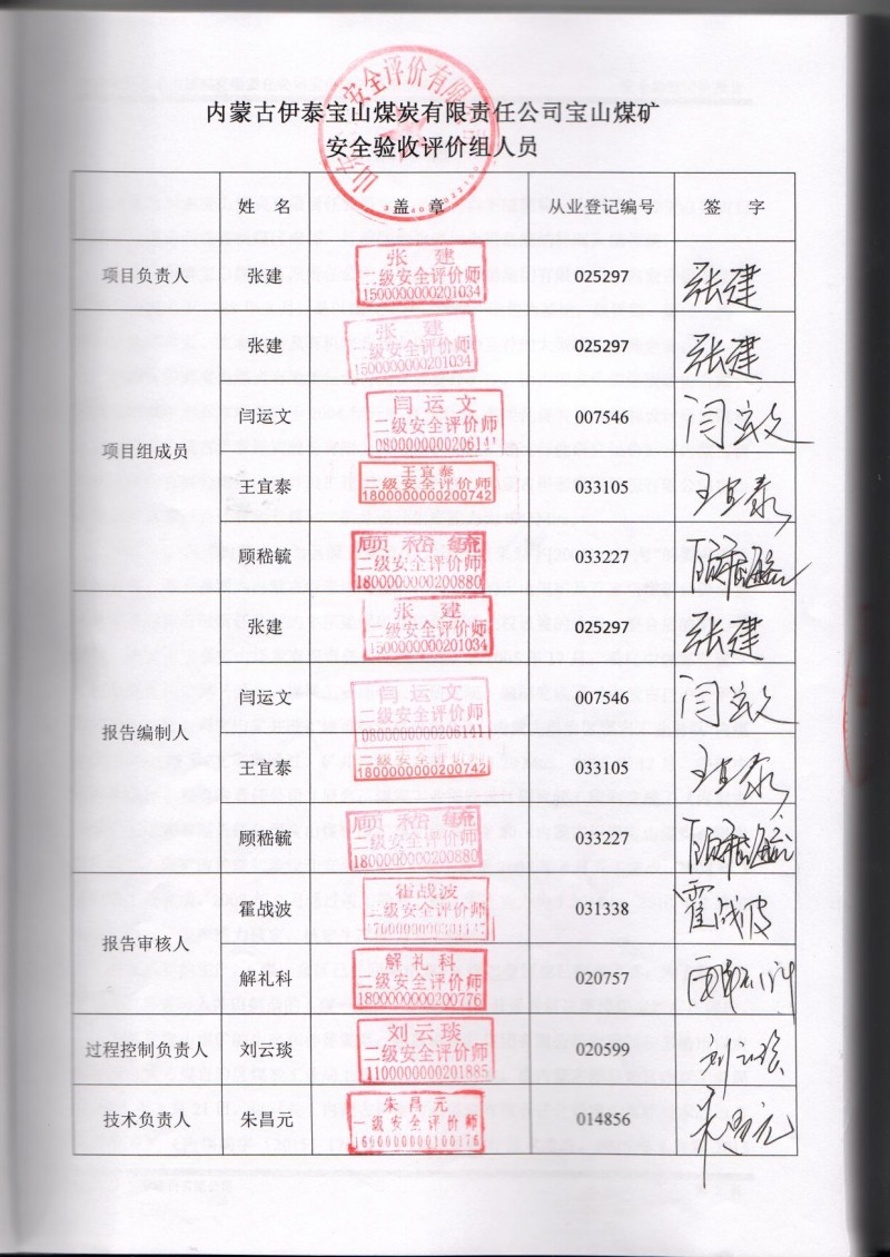 | 參與安全評價工作的安全評價師: 張建、閆運文、王宜泰、顧嵇毓 |