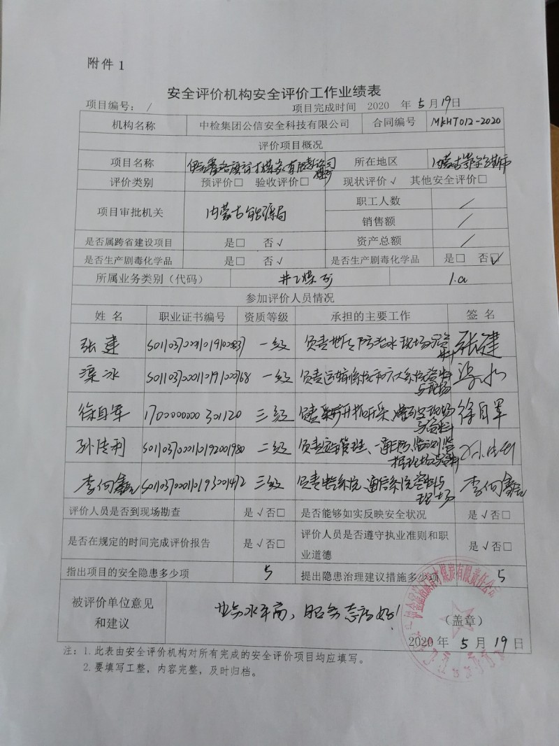 | 現(xiàn)場(chǎng)開(kāi)展安全評(píng)價(jià)工作的人員、時(shí)間及主要任務(wù): 孫傳利 張 建 渠 冰 徐自軍 李向鑫 于2020年4月15~16日到現(xiàn)場(chǎng)進(jìn)行調(diào)查、搜集資料,進(jìn)行現(xiàn)場(chǎng)評(píng)價(jià)。 于2020年5月13日到現(xiàn)場(chǎng)對(duì)評(píng)價(jià)時(shí)存在的問(wèn)題進(jìn)行了復(fù)查。 |