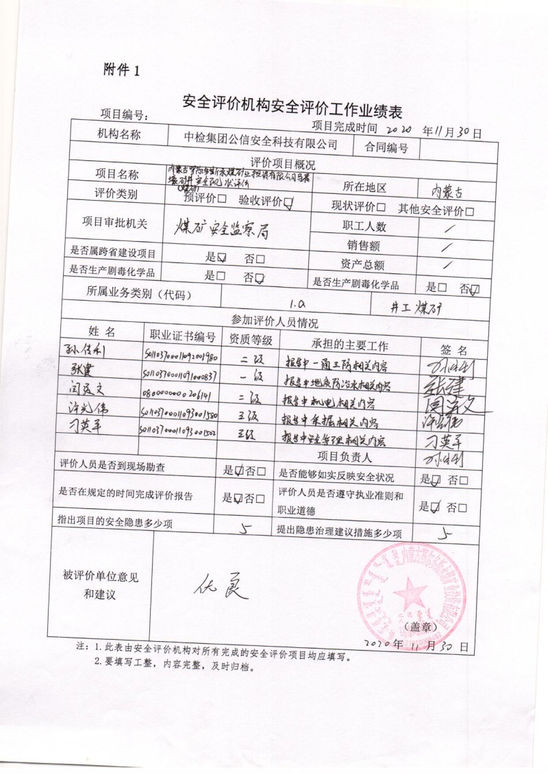 | 現(xiàn)場(chǎng)開展安全評(píng)價(jià)工作的人員、時(shí)間及主要任務(wù): 張建 閆運(yùn)文 孫傳利 許光偉 刁英平 于2020年10月8日到現(xiàn)場(chǎng)進(jìn)行調(diào)查、搜集資料,進(jìn)行現(xiàn)場(chǎng)評(píng)價(jià)。 于2020年10月20日到現(xiàn)場(chǎng)評(píng)價(jià)時(shí)存在的問題進(jìn)行了復(fù)查。 |