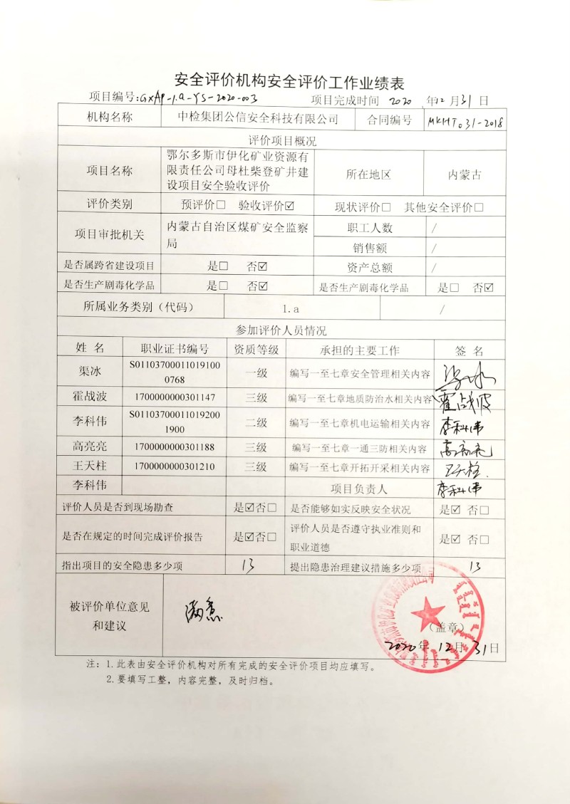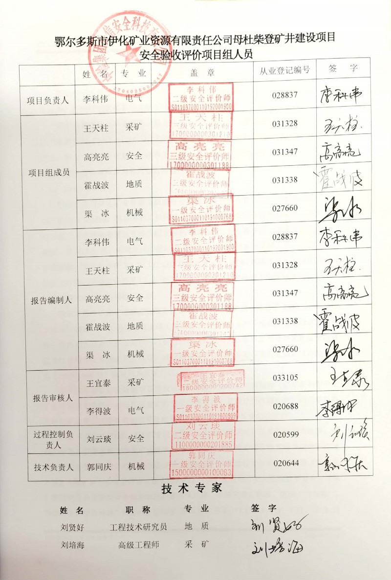 參與安全評價(jià)工作的注冊安全工程師:王天柱、高亮亮、霍戰(zhàn)波、渠冰