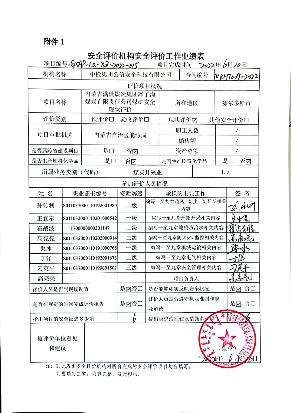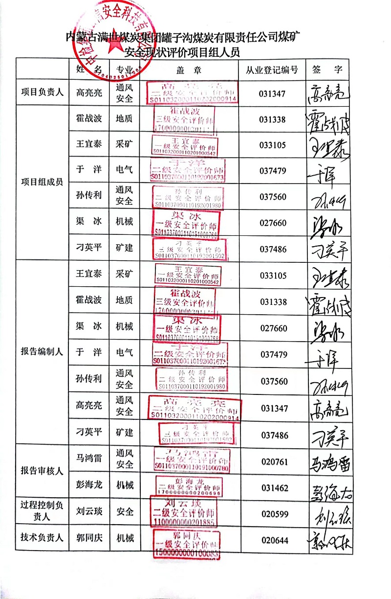 | 評價項目名稱 | 內(nèi)蒙古滿世煤炭集團(tuán)罐子溝煤炭有限責(zé)任公司煤礦安全現(xiàn)狀評價報告 | ||||||